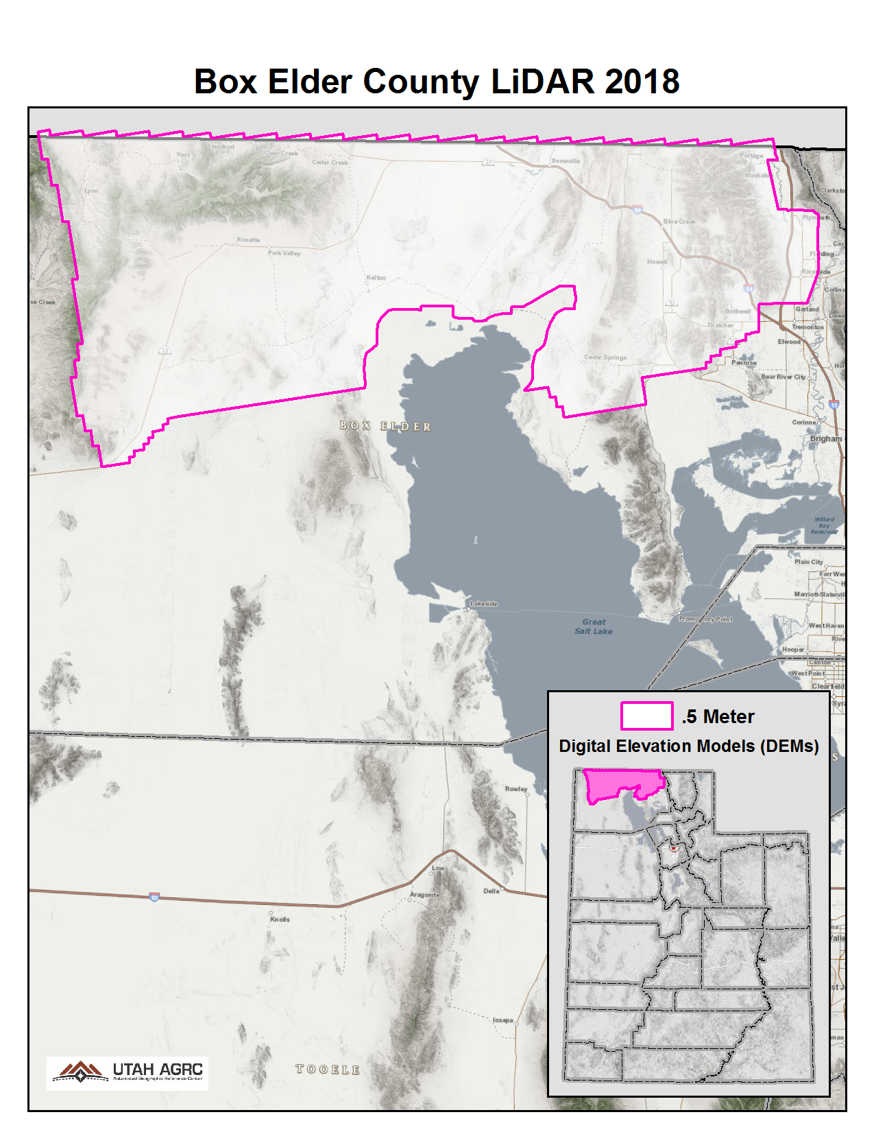 During 2018 UGRC, the Natural Resource Conservation Service (NRCS), and the Utah Geological Survey (UGS) acquired ~2,271 square miles of 8 points per meter Quality Level 1 Lidar for areas in Northern Utah. The 0.5 meter resolution bare earth DEMs and first-return/highest-hit DSMs in .tif format have a 10.0cm vertical RMSE accuracy and are available for download. The LAS point clouds are available from The National Map , opens in a new tab .